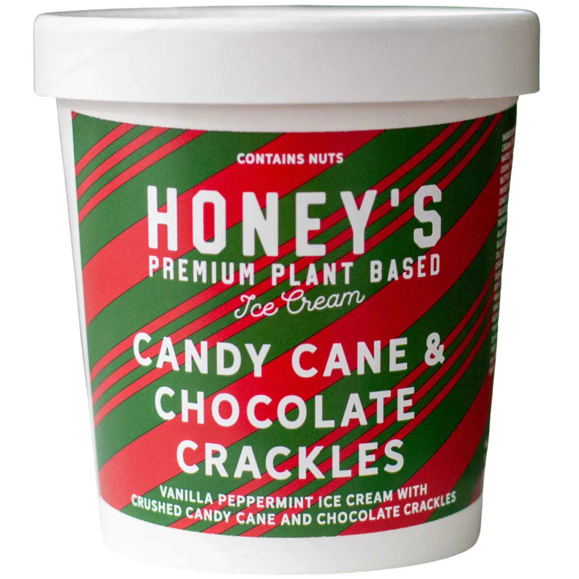 Ingredients: Cashew Cream (Cashews, Water), Organic Coconut Cream, Organic Sugar, Cocoa Butter, Organic Coconut Oil, Invert Sugar, Candy Cane (Sugar, Glucose Syrup, Peppermint, Tartrazine, Allura Red, Brilliant Blue, Glycerin, Canola Oil, Sunflower Lecithin), Chocolate, Vanilla, Peppermint, Kosher Salt, Guar Gum
